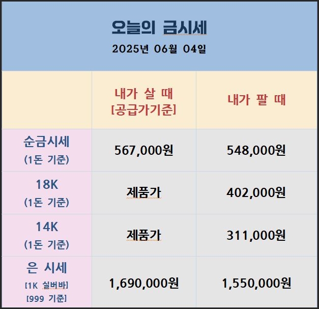 2025년 6월 5일부터 시행되는 트럼프의 철강·알루미늄 관세 인상은 금에 대한 안전자산 수요를 자극하며 가격 상승을 견인하고 있습니다. 국제 금 시세는 $3,300대를 회복한 뒤 $3,400 저항 돌파를 재차 시도 중입니다. 은 가격은 $34.8에 근접하며 52주 신고점 돌파 가능성을 높이고 있습니다. 시장에서는 안전자산 선호와 기술적 돌파 기대가 동시 반영되는 모습입니다. 오늘의 국내 금시세[25.06.04] ✅ 국내 금시세, 3주 만에 최고치 재돌파!- 국제 금 급등세 영향에 따라 국내 금값도 강세 전환, 1돈당 567,000원 기록하며 3주래 최고 시세 도달 ✅ 국내 은값, 반등 시도!- 2월 이후 최저 시세권에서 머물던 국내 은값, 오늘 드디어 첫 반등- 공급 부족에도 환율·수요 위축으로 ..