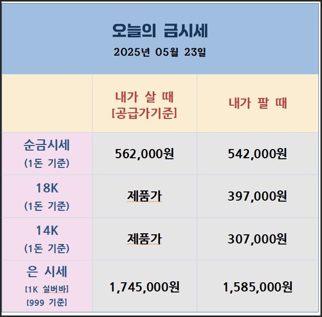 국제 금 시세는 $3,300선을 지지하며 단기 조정 이후 반등 흐름을 이어가고 있습니다. 은 시세 역시 $33선을 안정적으로 지켜내며 강세장이 지속될 수 있는 기반을 다지고 있습니다. 중장기 수익률 기준으로 금은 모두 +25% 이상 상승 중이며, RSI는 추가 상승 여력을 시사하고 있습니다. 오늘의 국내 금시세[25.05.23] ✅ 국내 시세, 국제가 대비 낮은 공급가- 환율이 내려가면서 국내 금값은 국제 시세만큼 많이 오르지 못하고 있습니다. - 환율을 감안해도 국내 공급가는 돈당 1만원정도 적게 책정되었습니다.✅ 국내 은값 - 국내 은값 큰 변동없이 안정적인 흐름입니다.▣ 국내금시세 등락률 [정일품골드: 골드바 정보 바로가기] ☛ https://tinyurl.com/ywvj7yxh [정일품 실..
