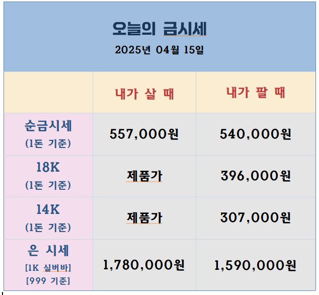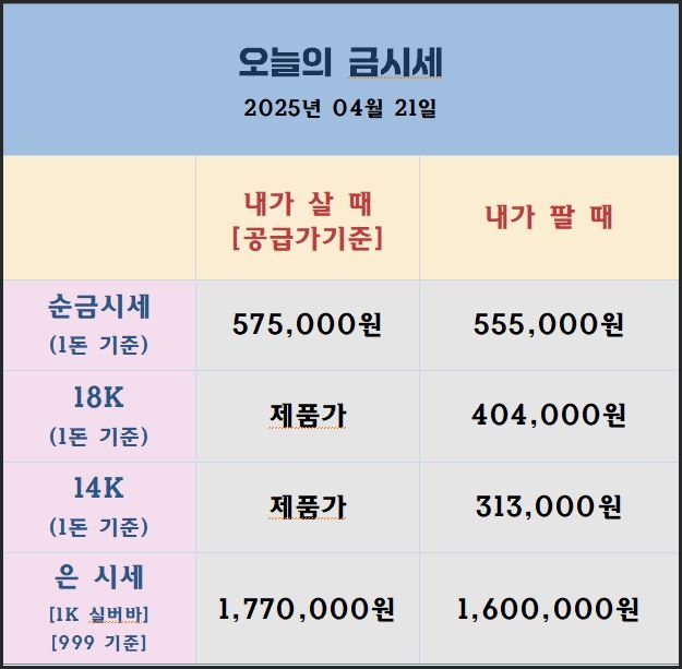 최근 국제 금 시세는 $3,500 돌파 이후 차익 실현 매물로 하루 만에 3% 하락하며 숨 고르기에 들어갔습니다. 월가의 전문가들을 여전히 금이 저평가 상태이며 중앙은행들이 매입을 지속 중이라고 분석했습니다. 은 가격은 공급 부족과 산업 수요 증가 속에 여름까지 온스당 $50을 향한 강세 흐름이 이어질 것으로 전망됩니다. 오늘의 국내 금시세[25.04.24] ✅ 국내 금값 큰 폭 상승 - 어제 금값은 단기 저항에 하락하였으나 오늘 소폭 상승 출발하였습니다. - 시세 변동 폭이 아주 큽니다. 구매 하시는 시점 시세를 꼭 확인 하세요. ✅ 국제 금값 대비 저렴하게 책정[역프리미엄]- 국제 시세 대비 2만원 이상 저렴하게 나오고 있습니다. ✅ 은값 상승 압력- 국제 은값이 상승 조짐입니다. - 국내는 여전..