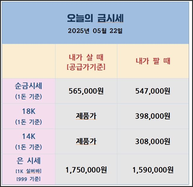 미국 1분기 GDP가 예상보다 낮은 0.2% 감소를 기록하면서 경기 둔화 우려가 확대되고 있습니다. 달러 약세와 국채 금리 하락도 겹치며 안전자산인 금과 은에 대한 투자 심리가 다시 살아나는 모습입니다. 현재 금과 은 모두 기술적으로 중립권에 있으나, 경제 불확실성이 지속될 경우 추가 상승 여력이 존재합니다. 오늘의 국내 금시세[25.05.30] ✅ 국내 금시세 상승폭 제한- "국제 금값은 달러 약세에 힘입어 강보합을 보였지만, 원/달러 환율 하락과 시차 반영 영향으로 인해 국내 금값은 제한적인 상승에 그쳤습니다." ✅ 국내 은값 - 국내 은 가격 올해 2월이후, 최저가격(매수 타이밍)- 공급 부족에도 불구하고 가격은 일시 하락!(환율, 수요등 복합적 요인) ▣ 국내금시세 등락률 [정일품골드:..
