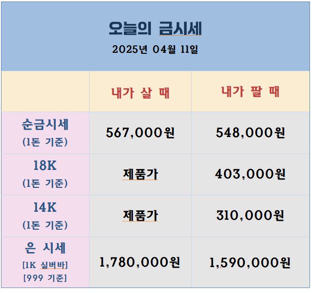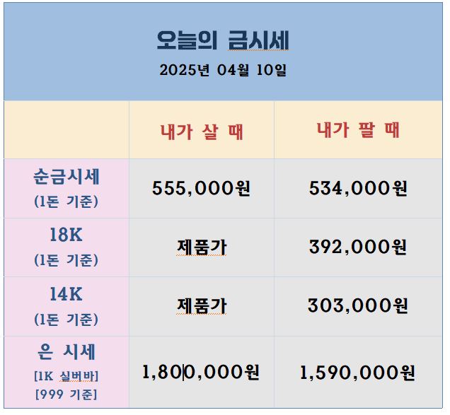2025년 4월 15일, 금 가격은 온스당 $3,223로 사상 최고치를 경신하며 강세 흐름을 이어갔습니다. 은은 공급 부족 이슈 속에 $32.25 수준에서 조정을 받으며 상승 준비 국면에 있습니다. 주요 뉴스는 금의 조정과 재반등 가능성, 연준 정책과 은 수요에 대한 분석에 집중되고 있습니다. 오늘의 국내 금시세[25.04.15] ✔ 국내 금시세가 국제시세보다 저렴합니다.[수요 부족] ✔ 시세 변동이 많으니 구매 하시는 실시간 시세를 꼭 확인하세요. ✔ 은시세도 금값과 함께 동반 상승추세이며, 실물 은 시장을 여전히 강세입니다.▣ 국내금시세 등락률 오늘의 국제 금시세[25.04.15] 📊 국제 금 시세 분석 (2025-04-15 기준)✅ 현재 시세 개요 금 시세: 3,223.32 USD/oz일..