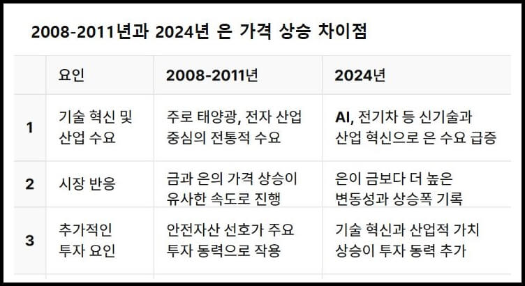 금리 인하와 AI 기술 확산으로 인해 은 가격 상승 가능성이 주목받고 있습니다. 과거 금융위기와 현재의 은 상승이 아주 유사한 점이 많으면 AI의 발전으로 은의 상승동력은 더 탄력을 받았습니