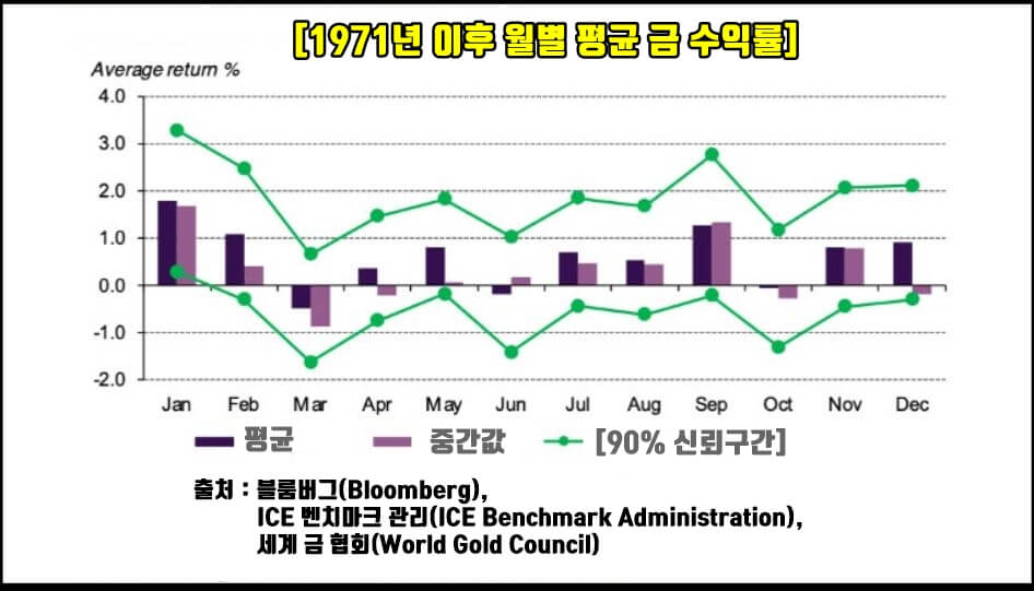 위 도표는 1971년부터 2023년까지의 데이터를 바탕으로 월별 평균 금 수익률을 시각적으로 보여줍니다.