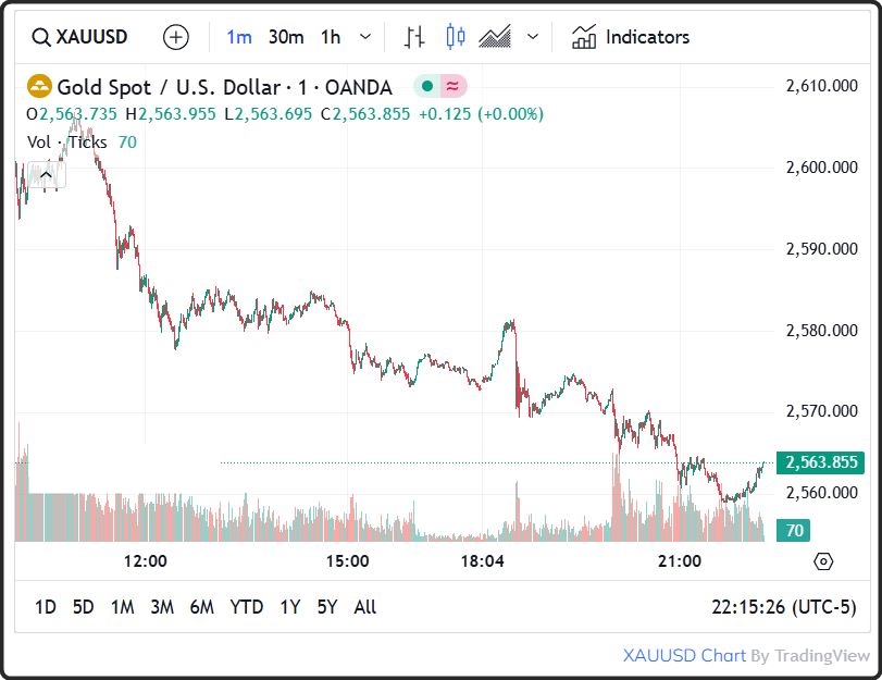 금 가격이 온스당 약 2,569달러로 전일 대비 3.30달러(-0.13%) 하락했습니다. 이는 미국 달러 강세와 주식 시장 상승, 그리고 금리 인상 우려 등 복합적인 요인에 기인합니다.