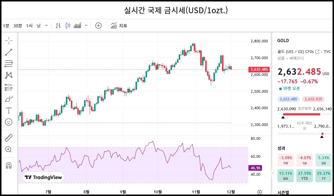 2024년 12월 2일 기준 금값은 2,628.50 USD/온스로, 전일인 11월 29일의 2,658.00 USD/온스 대비 29.50 USD 하락했으며, 약 -1.11% 의 하락을 기록했습니다.