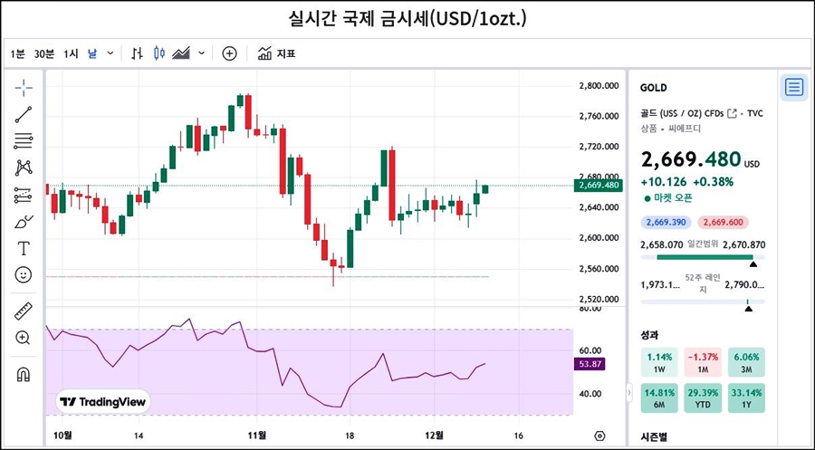 2024년 12월 10일 기준 금값은 2,668.30 온스로, 전일인 12월 9일의 2,650.00 온스 대비 18.30 달러 상승했으며, 약 0.69%의 상승한 수치입니다.