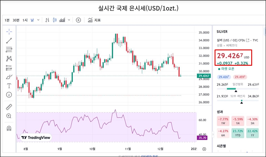 → 단기적으로 하락세를 보였지만, 연초 대비로는 은 가격이 23.72% 상승하며 상승 추세를 유지하고 있습니다.