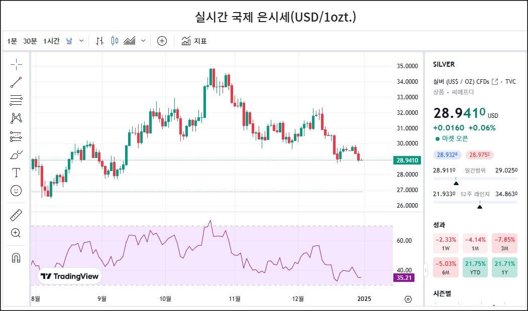은 시세는 최근 하락세를 이어가며 28.8 ~ 29.0 USD 구간에서 하단 지지선을 형성하고 있습니다.