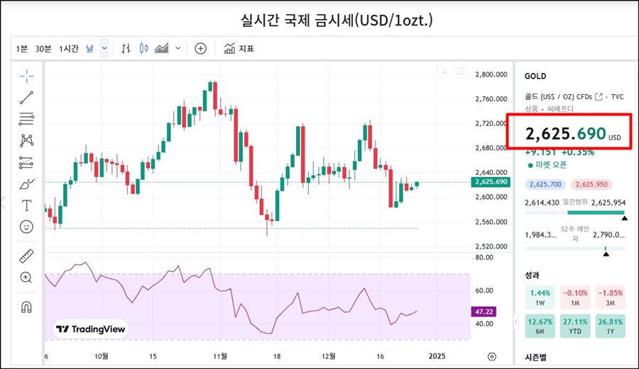 가격: 현재 금 시세는 2,625.690 USD/oz로, 소폭 상승(+0.35%)한 모습을 보입니다.