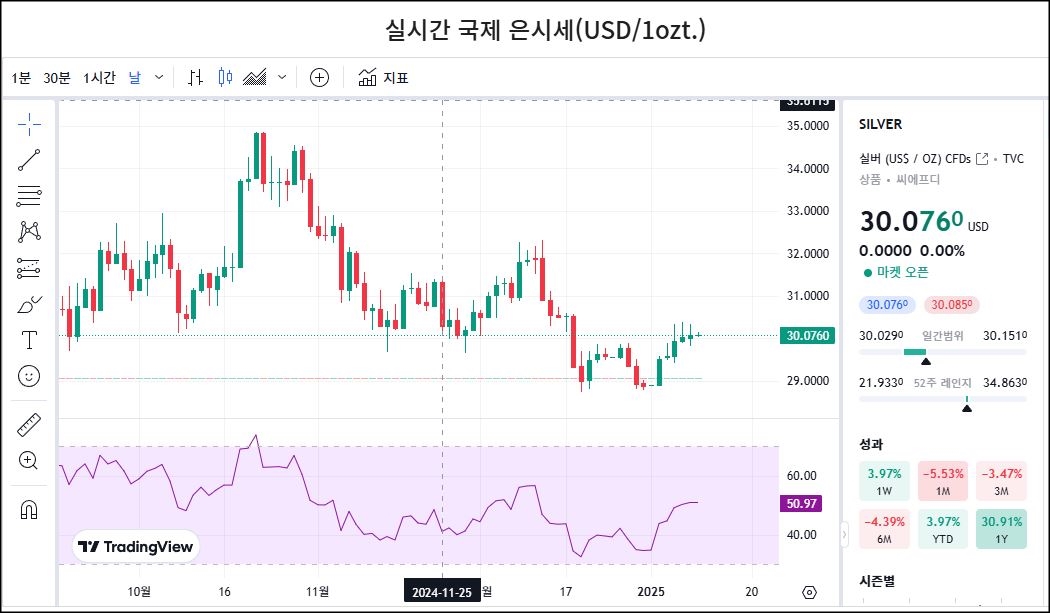 은 시세는 현재 안정적인 지지선 위에서 움직이고 있으며, 조정 후 추가 상승 가능성이 존재합니다. 분할 매수 전략을 활용하여 $30 부근에서 매수를 시작하고, $29 이하로 떨어질 경우 추가 매수 기회를 엿보는 것이 바람직합니다.