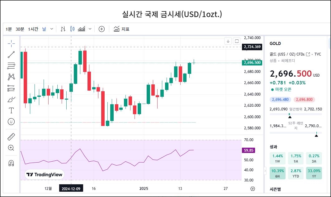 단기적으로 금 가격은 안정적인 상승 흐름을 이어갈 가능성이 높으며, $2,724를 돌파할 경우 추가 상승 동력을 얻을 수 있습니다. 그러나, 글로벌 경제 및 금리 관련 뉴스에 민감할 수 있으니 지속적인 모니터링이 필요합니다.