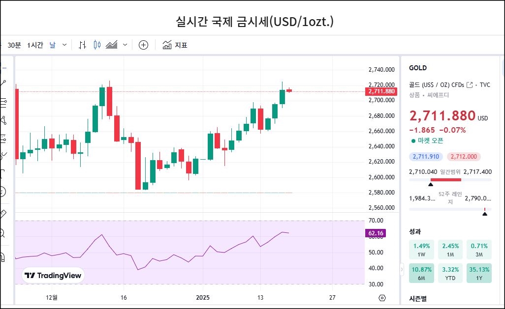 - 현재 금 가격은 2,711달러로 연중 고점 부근에서 강한 상승세 유지