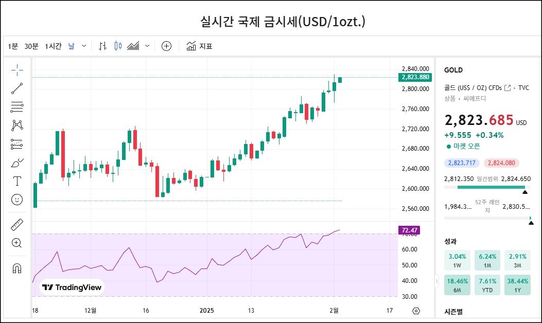 최근 국제 금 시세가 강한 상승 추세를 보이며 2,800 USD를 돌파하고 2,823 USD 부근까지 상승.