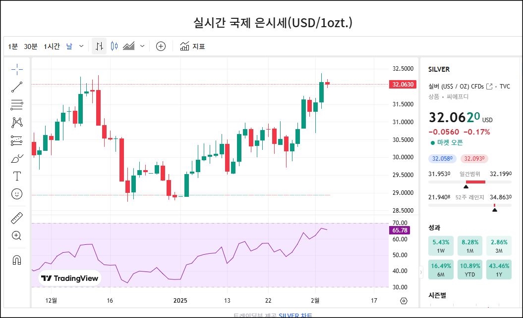 현재 은 가격은 32달러 선을 유지하며 상승세가 강하지만, 단기적으로 32.2달러에서 저항을 받을 가능성이 높음.