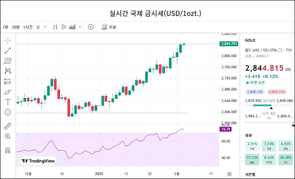 최근 상승 추세가 강하게 나타나며, 2,800달러를 돌파한 후 현재 사상 최고가 부근에서 거래 중.
