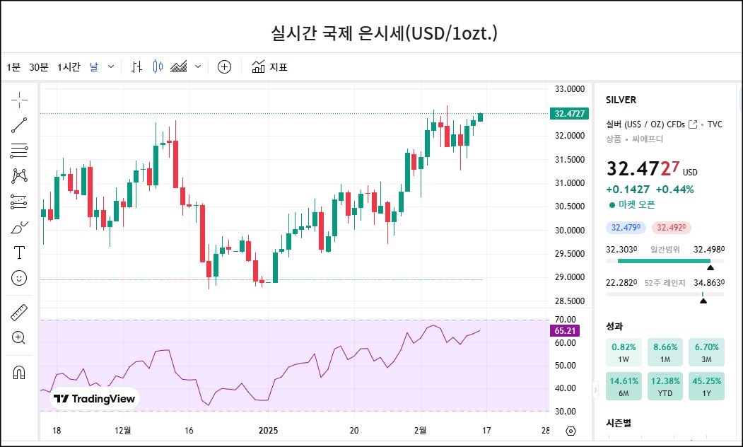 은 가격은 강한 상승세를 유지하고 있지만, 32.5 USD 돌파 여부가 단기 흐름의 핵심.