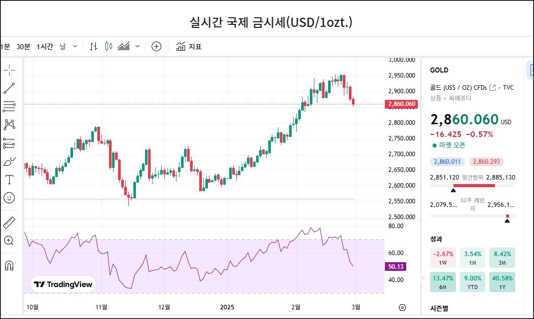 2025년 2월 28일, 2월 마지막날, 연준의 금리 인하 기대감이 약화되면서 달러 강세와 채권 금리 상승이 금 가격을 압박했고, 단기 차익 실현 매물이 출회되며 조정이 발생하였습니다.