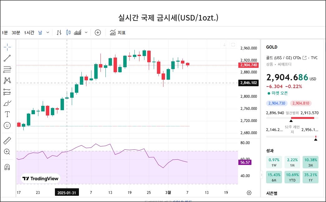 2025년 3월 6일, 오늘 금 가격은 2,900달러 부근에서 소폭 하락하며 관망세를 보이고 있습니다. 국내 금값은 2월 급등세 이후 최저가를 향해 달려가고 있습니다.
