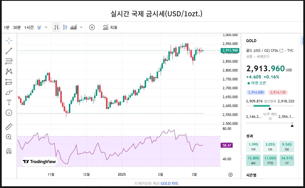 현재 금 가격은 2,900달러 이상을 유지하며 상승세를 지속하고 있음.