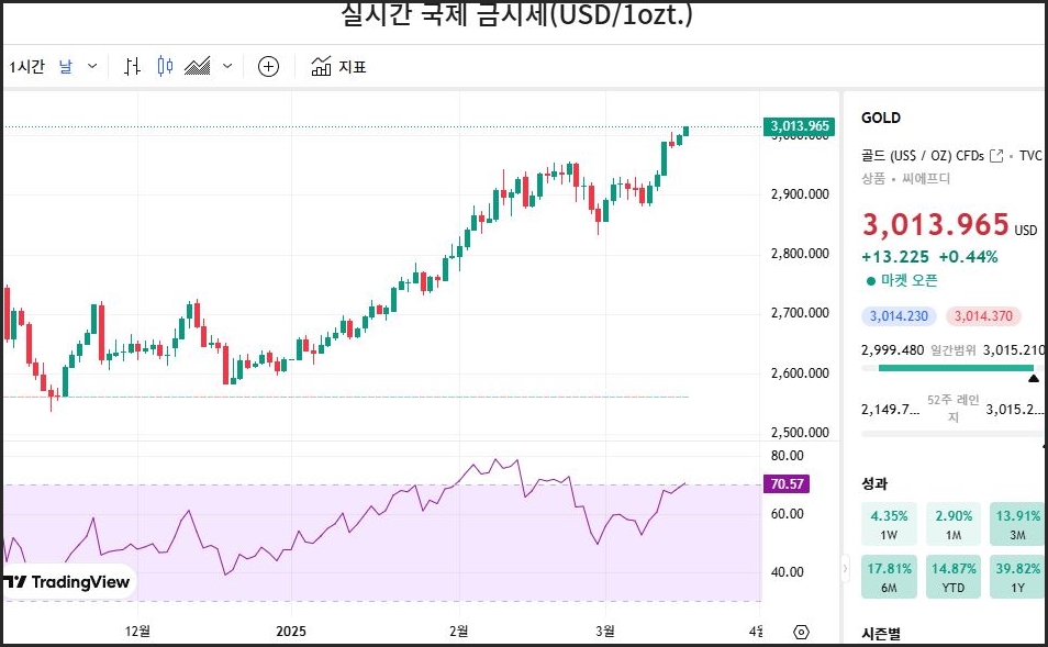 현재 금 가격은 강한 상승세를 이어가며 사상 최고치를 경신 중입니다. 다만, RSI가 과매수권에 진입해 단기 조정이 나올 수 있으며, 3,015달러 돌파 여부가 관건입니다. 장기적으로는 상승 모멘텀이 유지될 가능성이 높아, 조정 시 저가 매수 전략을 고려할 만합니다.