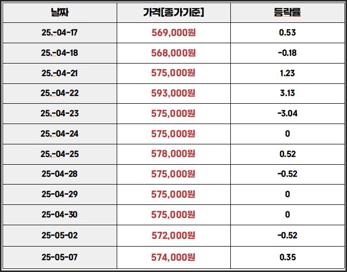 - 574,000원 오전장 출발, 오후시세는 다소 하락 예상됩니다.