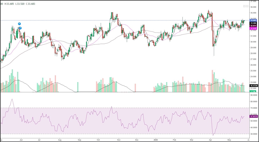 최근 고점 돌파를 재시도 중이며, $34.00 돌파 여부가 중요한 분기점