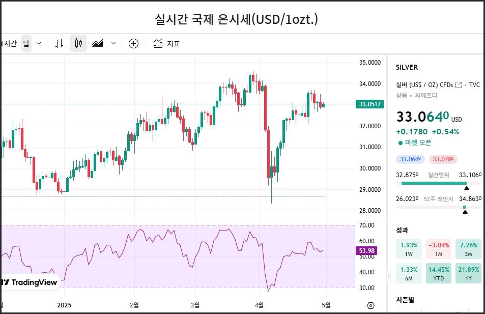 "은은 33달러 초반에서 지지력을 확보하며, 단기 재상승을 준비 중인 흐름입니다."