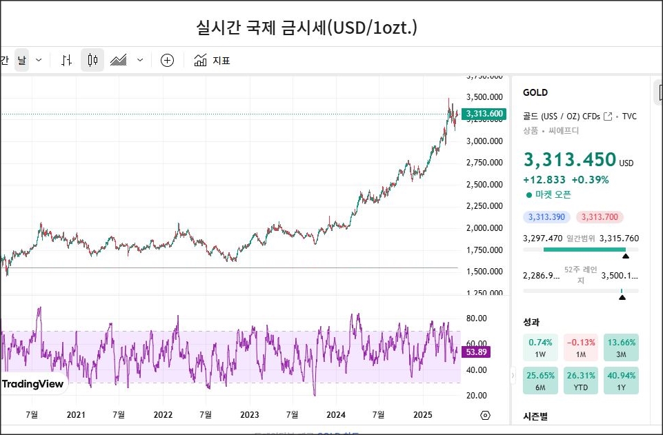 미국 휴장 이후 장이 열린 한국시간 오후 3시, 금 시세는 일시적으로 $3,300 아래로 내려갔습니다. 이는 미국의 EU 관세 연기 발표와 달러 강세, 기술적 매도세가 복합적으로 작용한 결과였습니다. 현재 금은 다시 $3,300선을 회복하며 단기 안정세를 유지 중입니다.