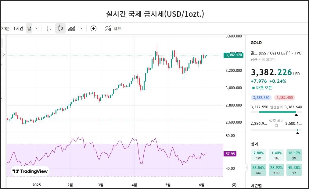 미국 서비스업 위축과 경제지표 부진, 달러 약세가 겹치며 금과 은 모두 강세를 보이고 있습니다. 금은 $3,382선에서, 은은 $34.5선에서 박스권 상단 돌파를 재차 시도 중입니다. 기술지표상 과열은 아니며, RSI도 추가 상승 여력을 시사해 강세 지속 가능성이 큽니다. 다만 국내 금값은 환율 영향 등으로 오히려 전일 대비 소폭 하락하며 국제 시세 상승을 온전히 반영하지 못했습니다.