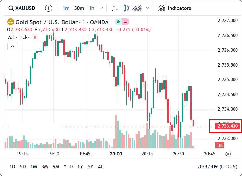 2024년 11월 5일 현재, 금 시세는 온스당 2,733.43달러로, 전일 대비 3.40달러 하락하여 0.12% 감소했습니다.
